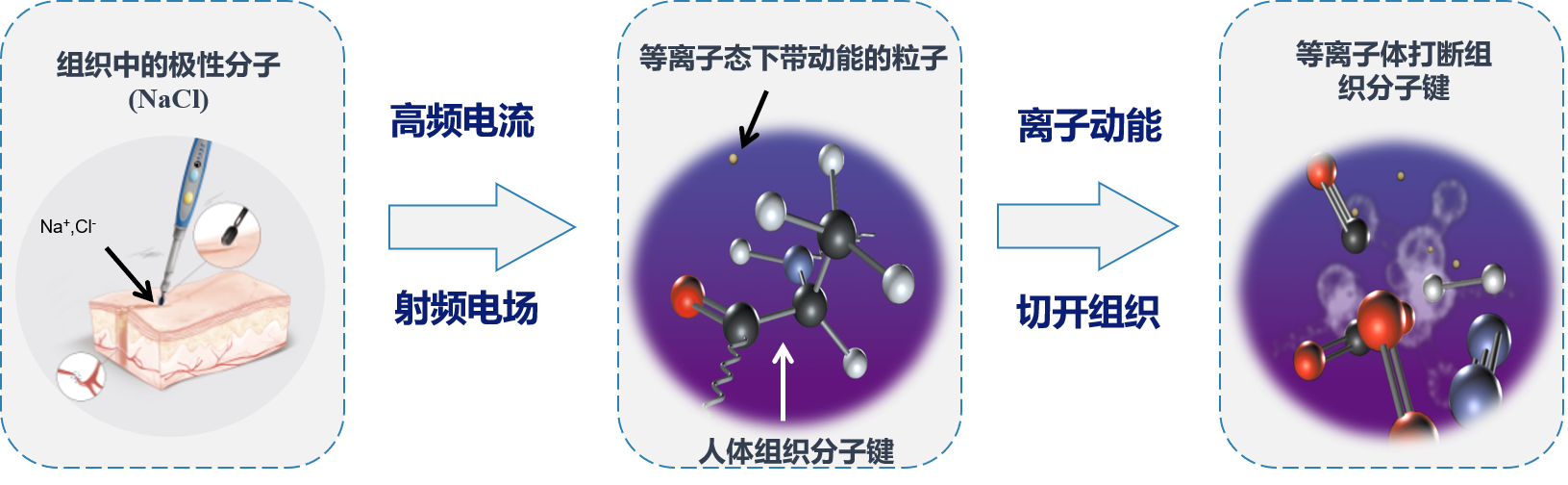 “低溫等離子手術(shù)設(shè)備”是近年來電外科發(fā)展史上的突破性技術(shù)。通過特定的電場在較低的溫度下激發(fā)人體組織中的介質(zhì)(NaCl)至等離子體態(tài),在電極前端形成低溫等離子體薄層。在電場的作用下,帶電粒子加速運(yùn)動,直至獲得足夠的動能打斷分子鍵,使組織分解,從而實現(xiàn)對組織的汽化、切割。